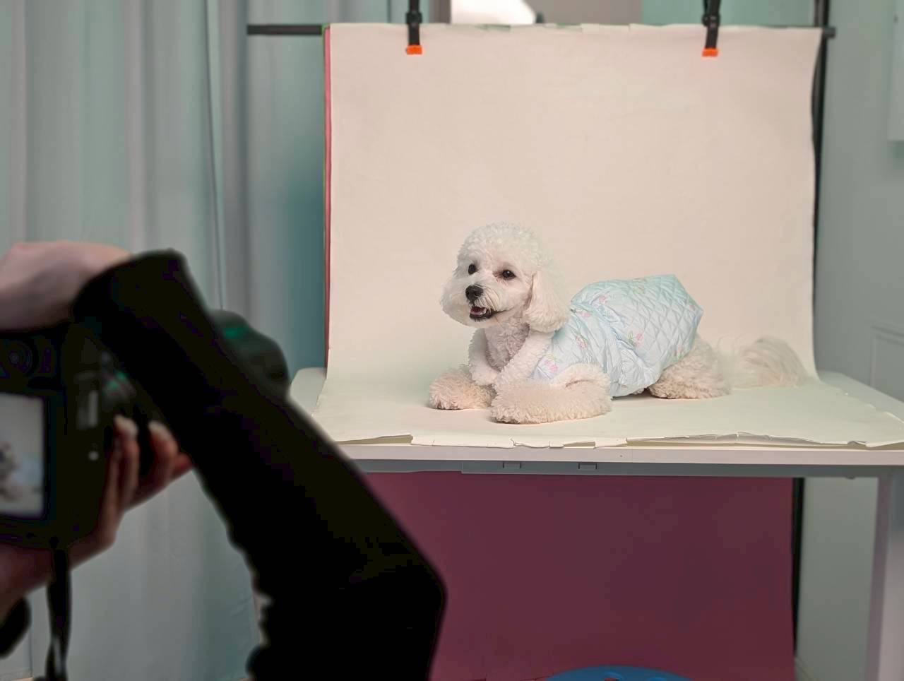 背景、照明、台の上にわんちゃんを乗せての撮影、まるでモデル気分です♪