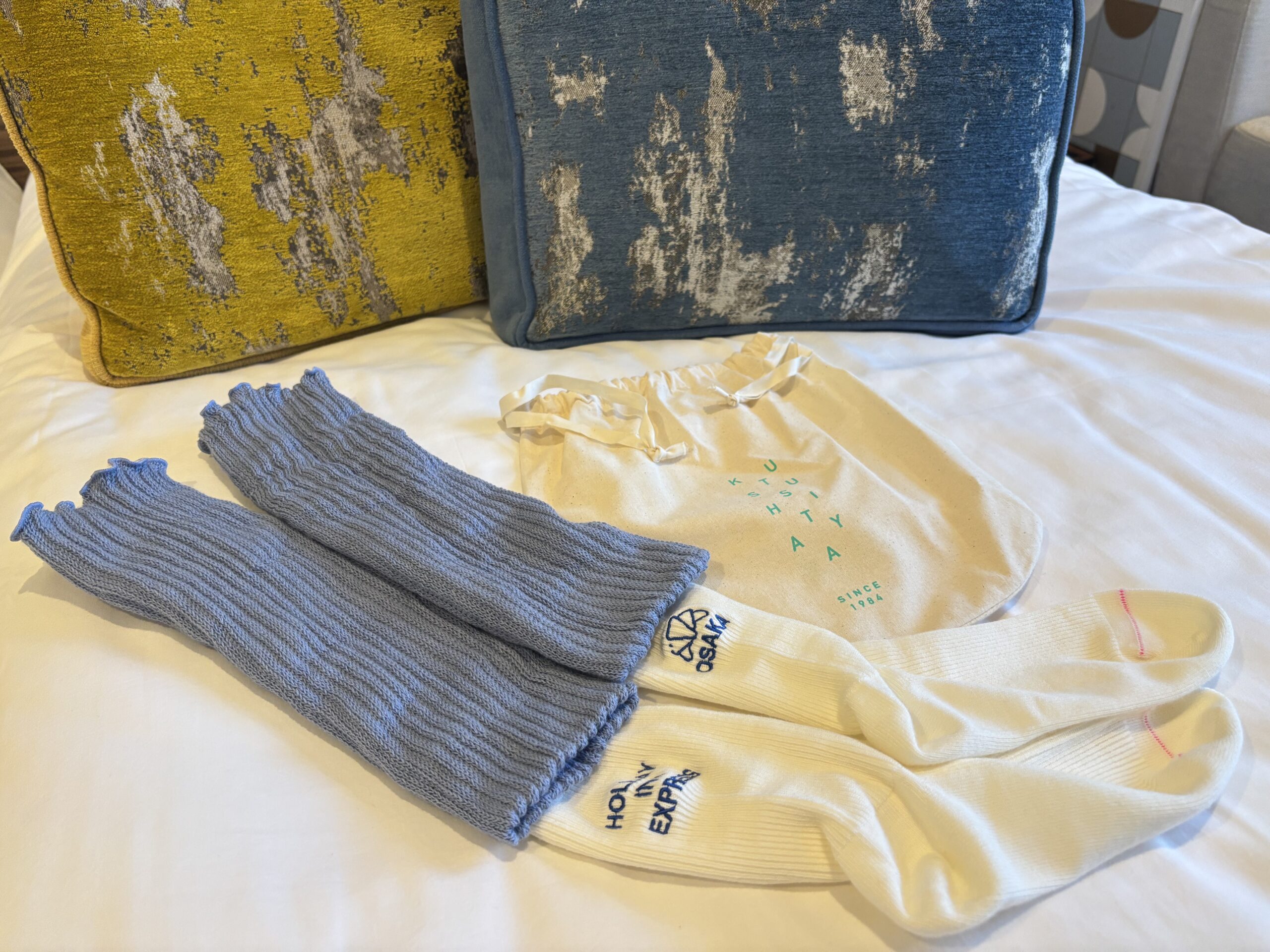 今回の特別宿泊プラン「開業4周年アニバーサリープラン」では、「Tabio(タビオ)靴下屋」によるホテル別注のオリジナル刺繍が入った靴下とレッグウォーマーのセットをアメニティとして用意されています!