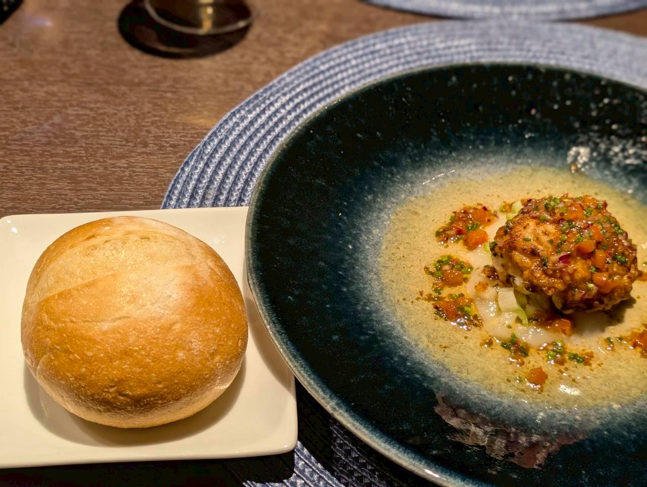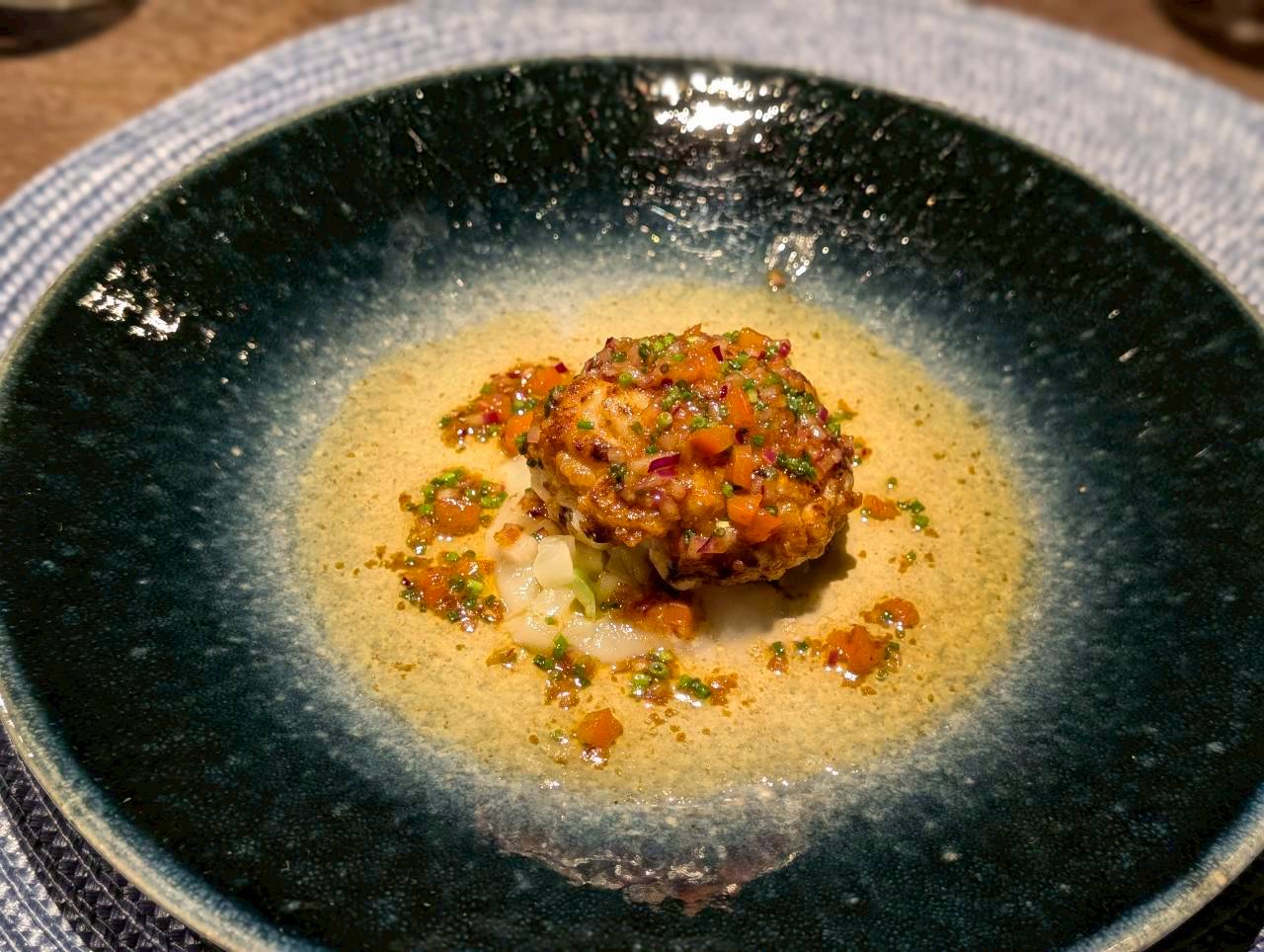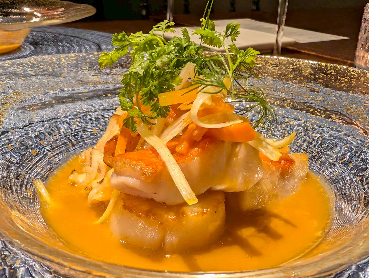 美しいお皿に乗せられた一品が店内の間接照明に照らされ、浮かび上がって見えるお料理。