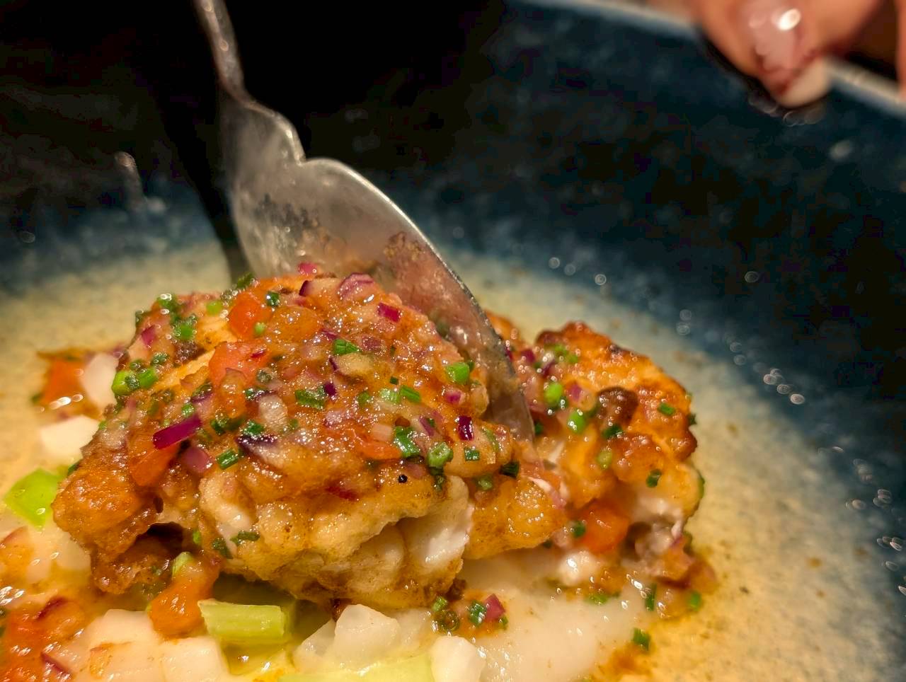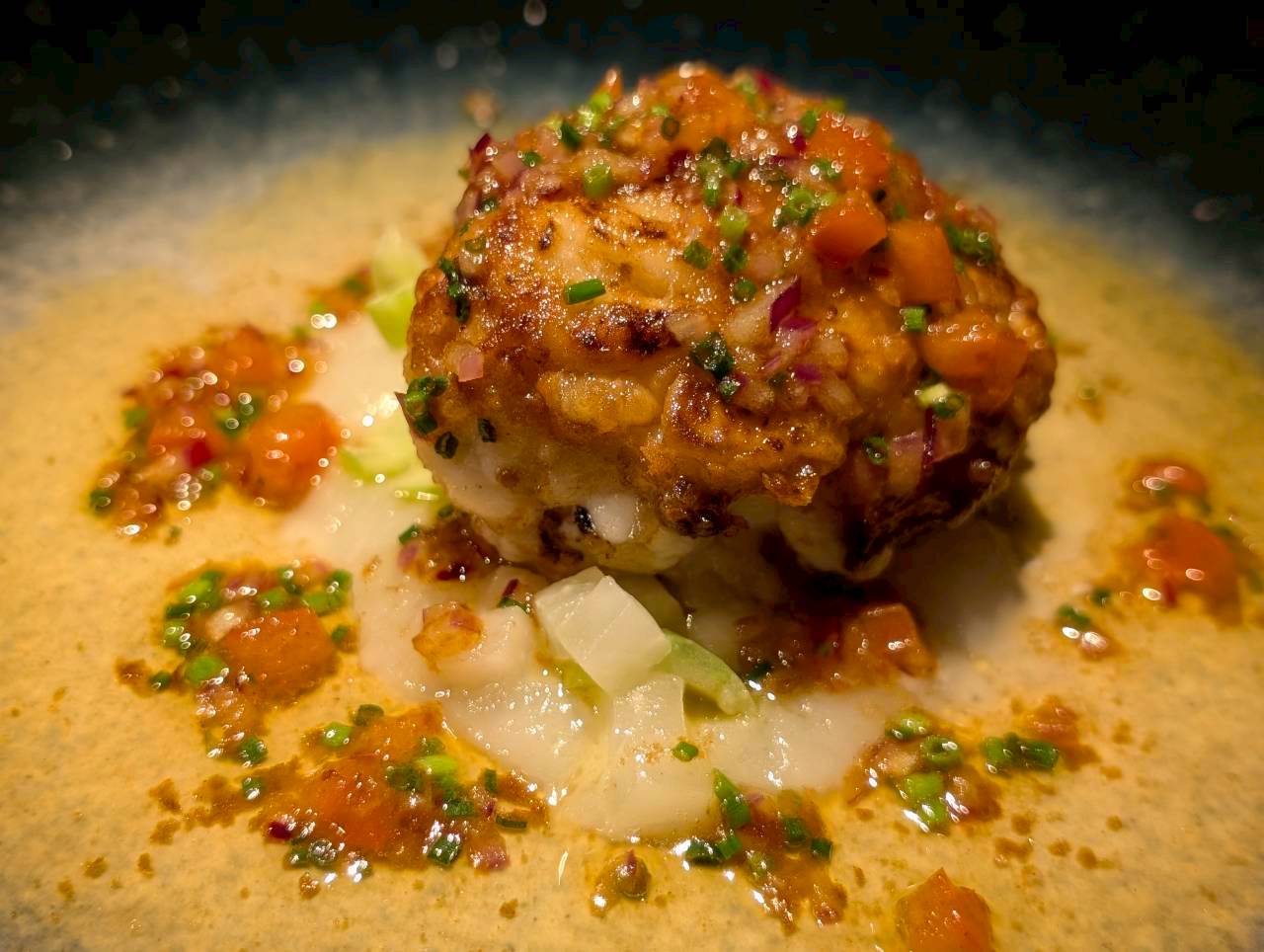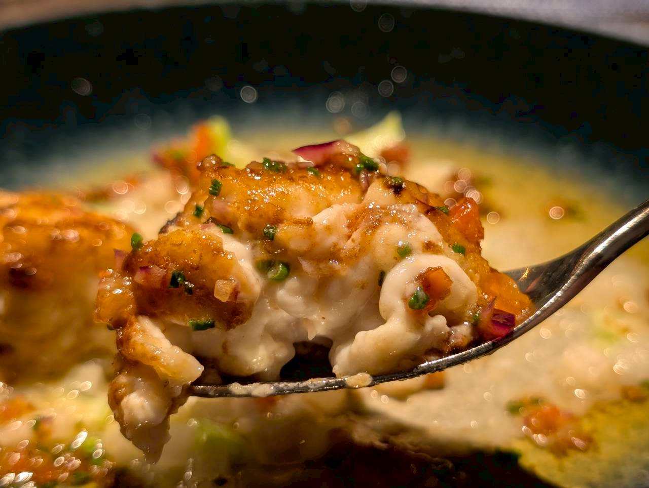 美しいお皿に乗せられた一品が店内の間接照明に照らされ、浮かび上がって見えるお料理。
