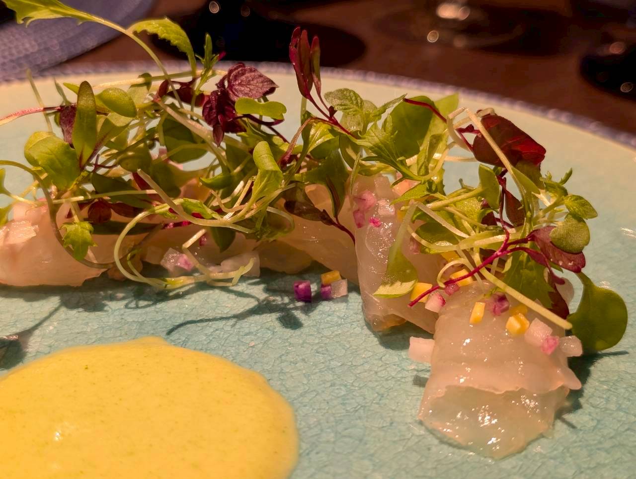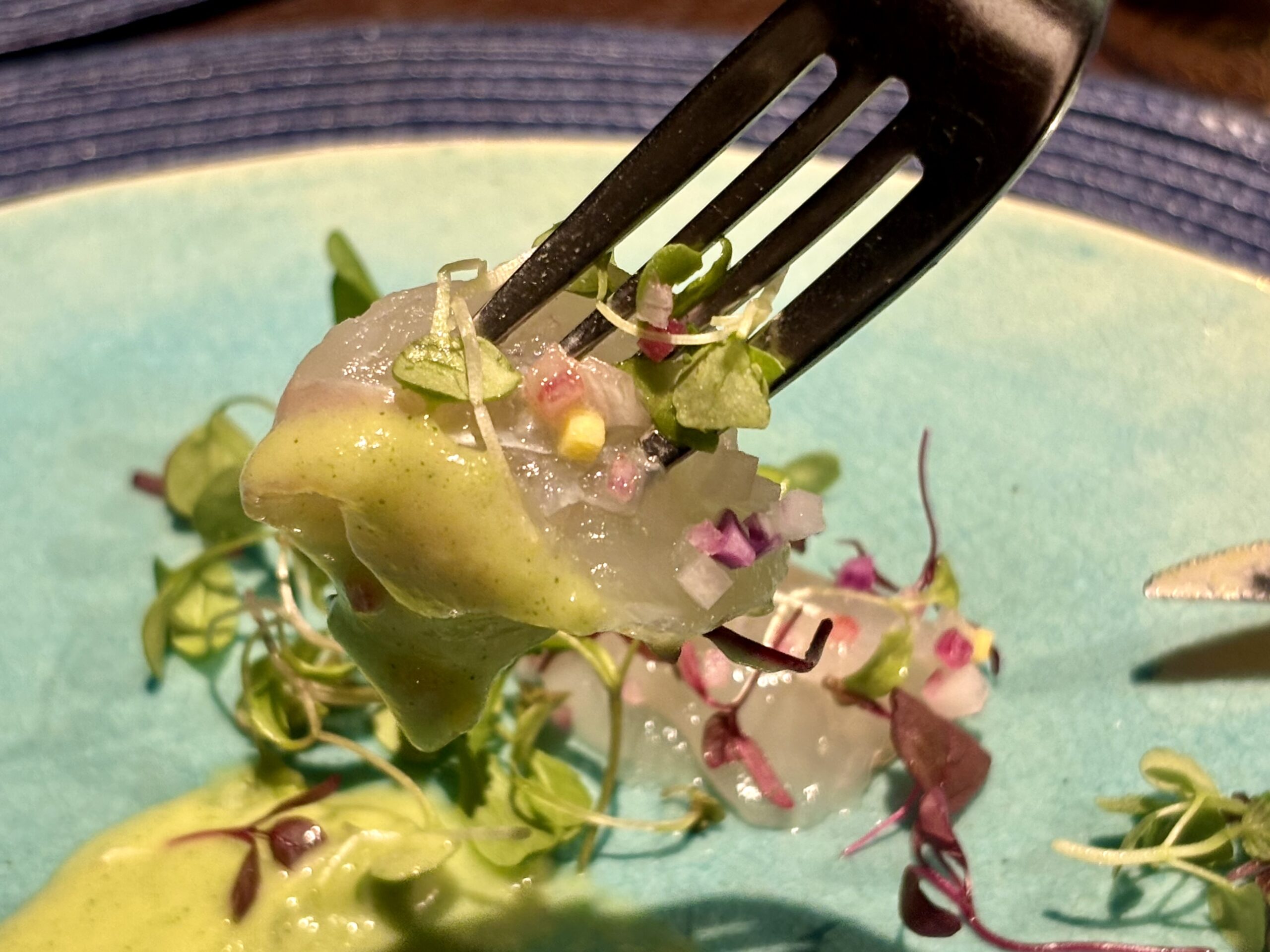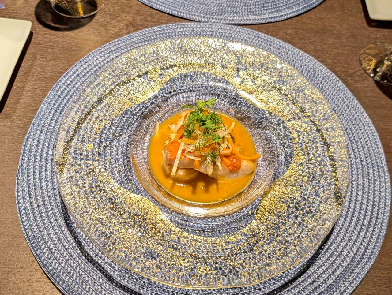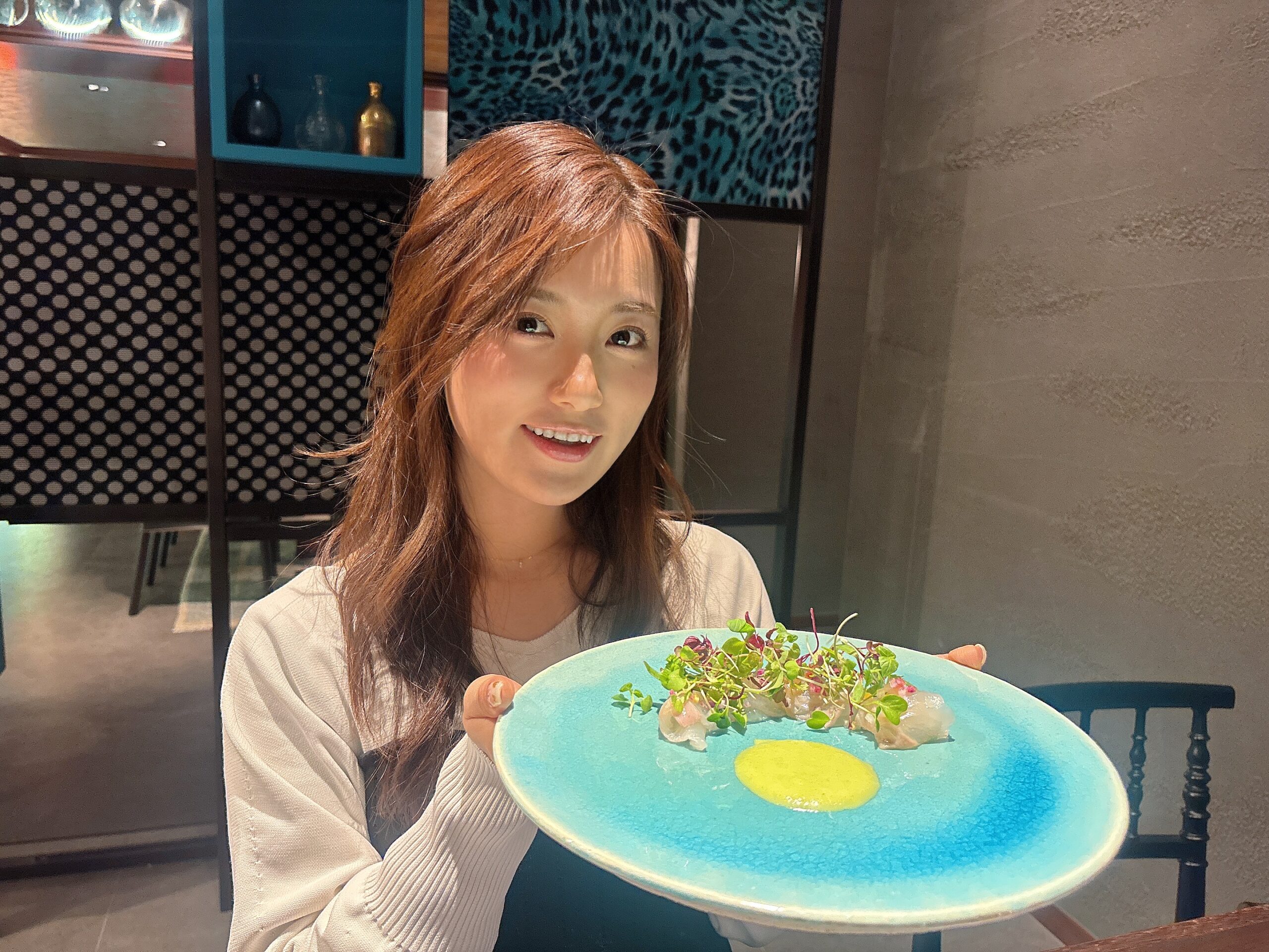 お料理の食器が全て、ガラスで透き通っているうえ、海が思い浮かぶような美しい色合いのものばかりで、お料理を運んできてくださる毎に、毎回とても素敵だなあとうっとりしました。