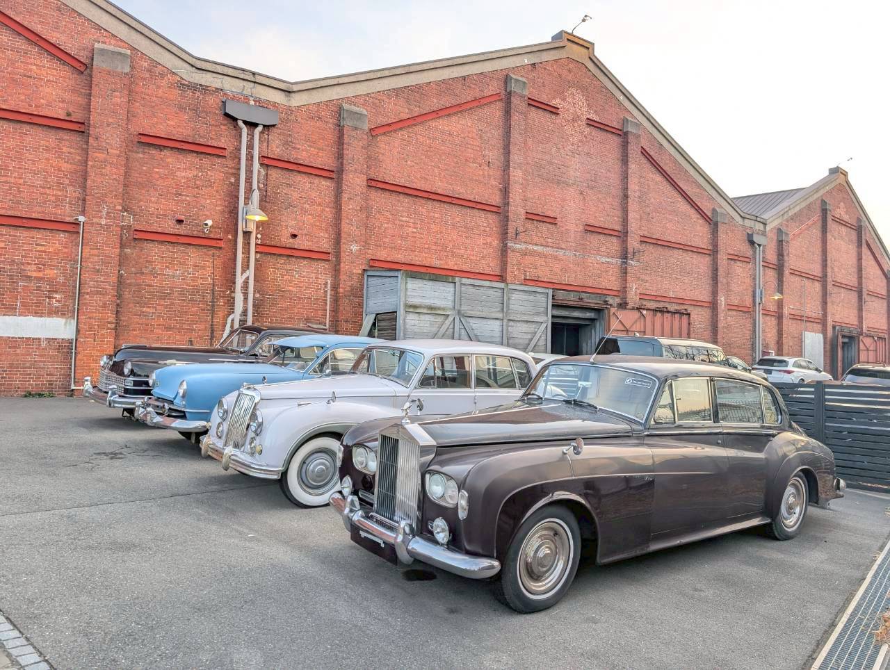 かっこよくお洒落なクラシックカーが並んでいるすぐ側に佇んでいる建物。