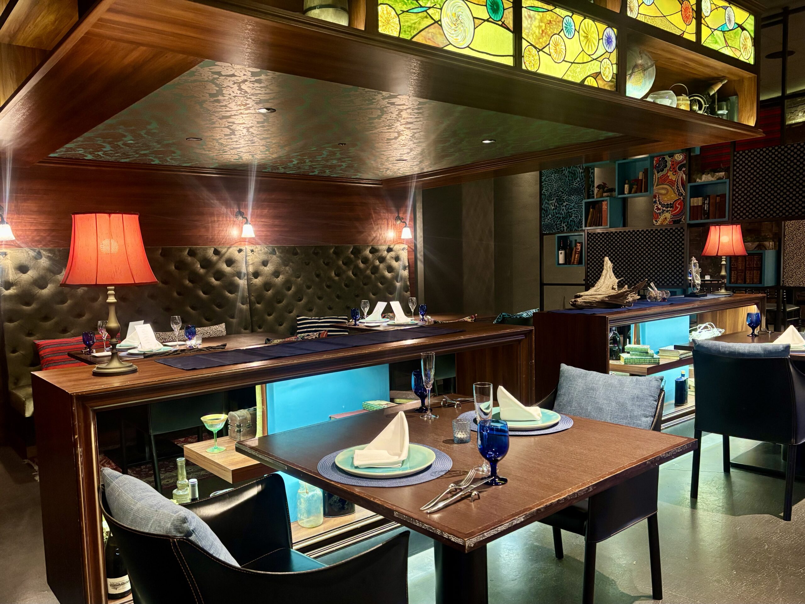 スタンドガラスが印象的で、照明の光とのコントラストが店内のお洒落さを引き立てていました。