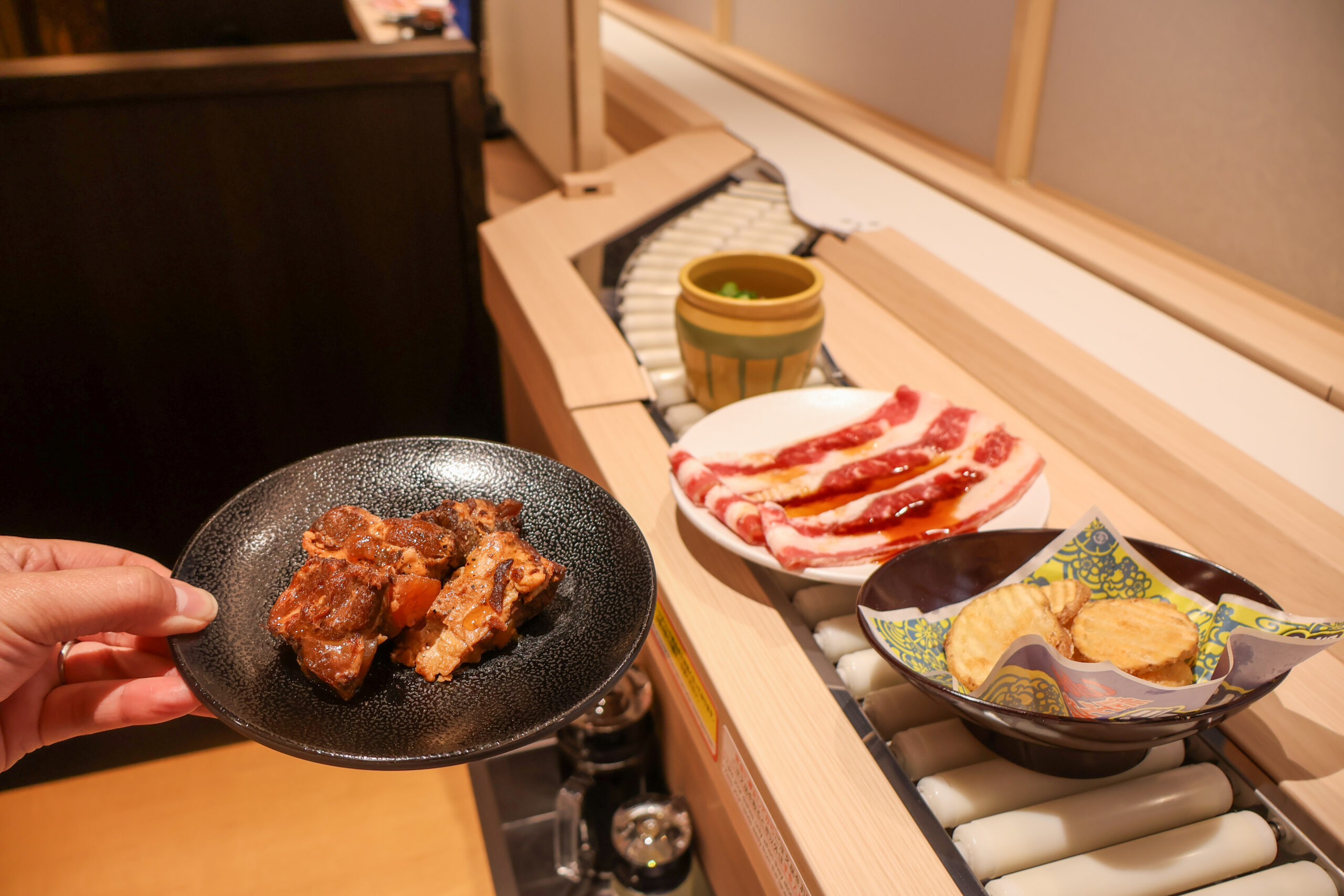 また、namBa HIPS店では、料理がレールでテーブルまで届く“特急レーン”が導入されており、注文した一皿がスーッと運ばれてくる様子も子ども心をくすぐる演出でした。