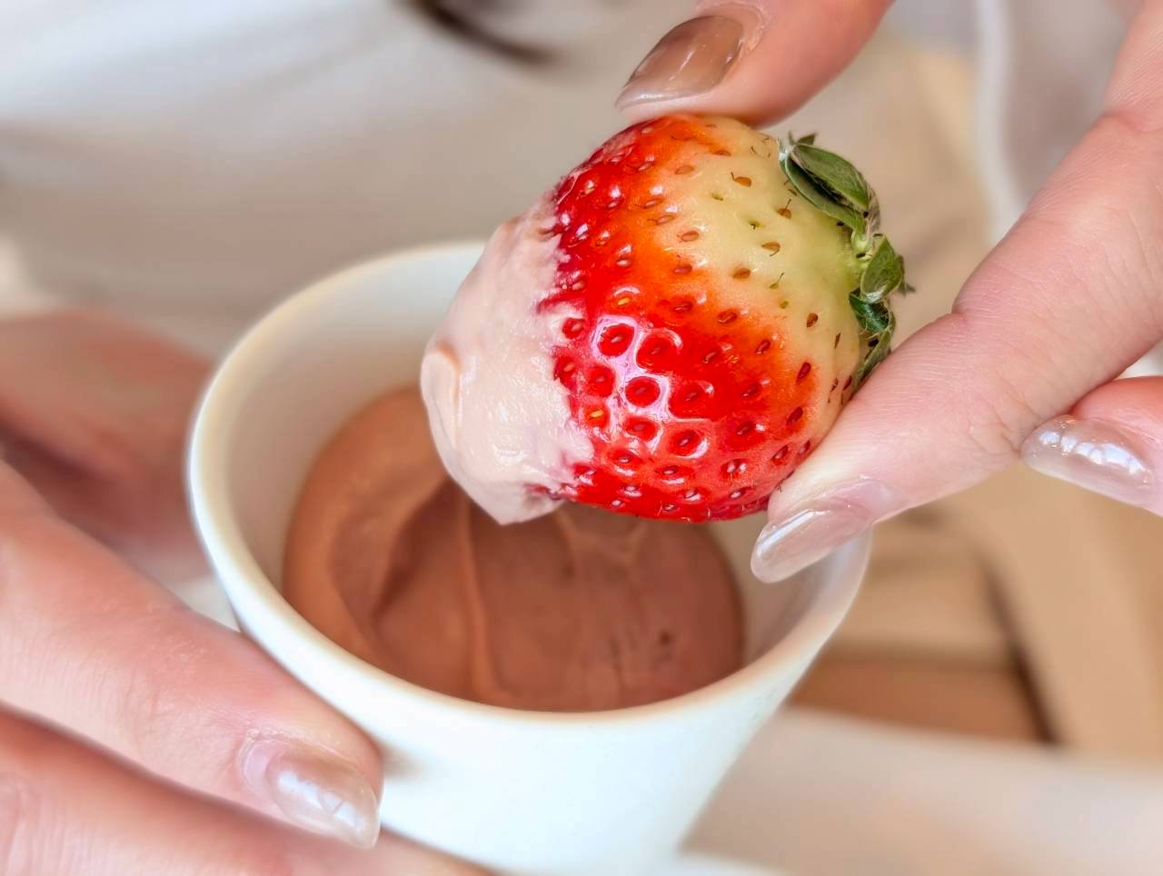 フレッシュいちごをピンク色のいちごガナッシュにディップして楽しむスタイル♪