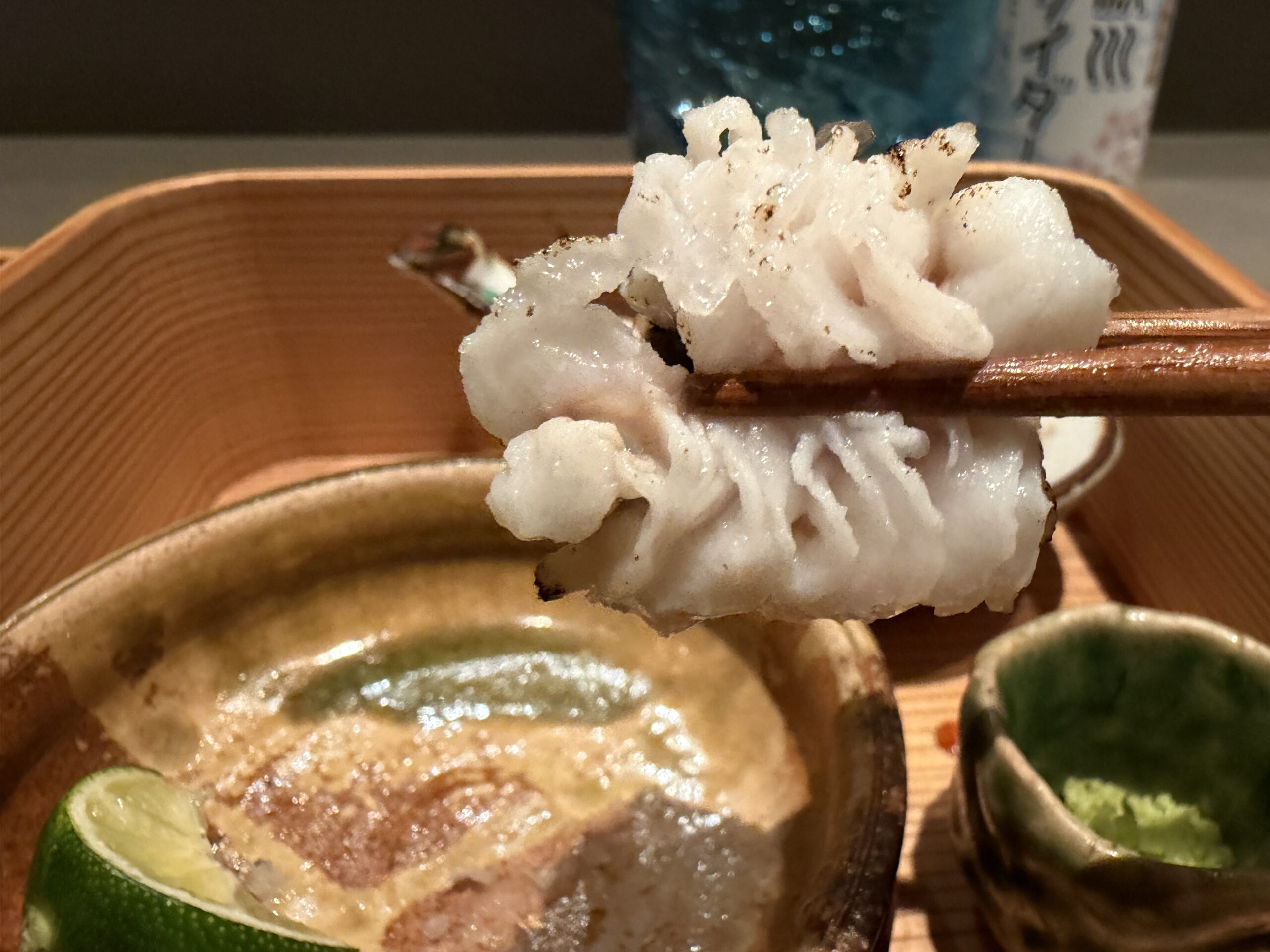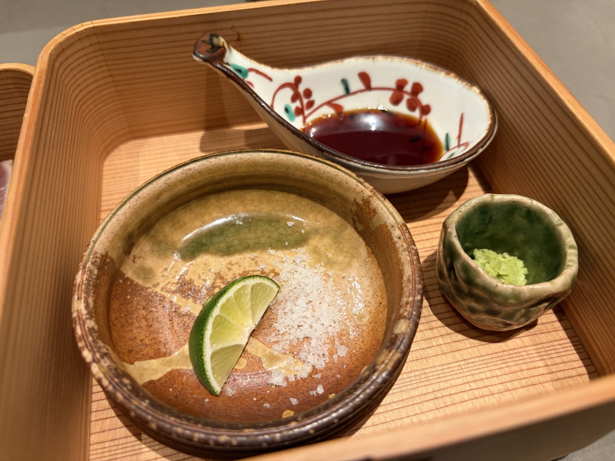 牡蠣醤油、山葵、マルゴンのお塩、酢橘をお好みで付けていただきます。