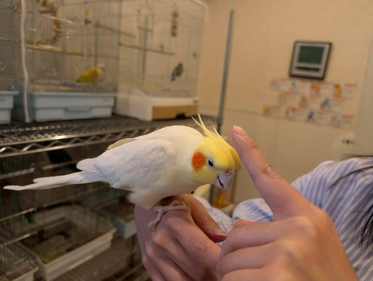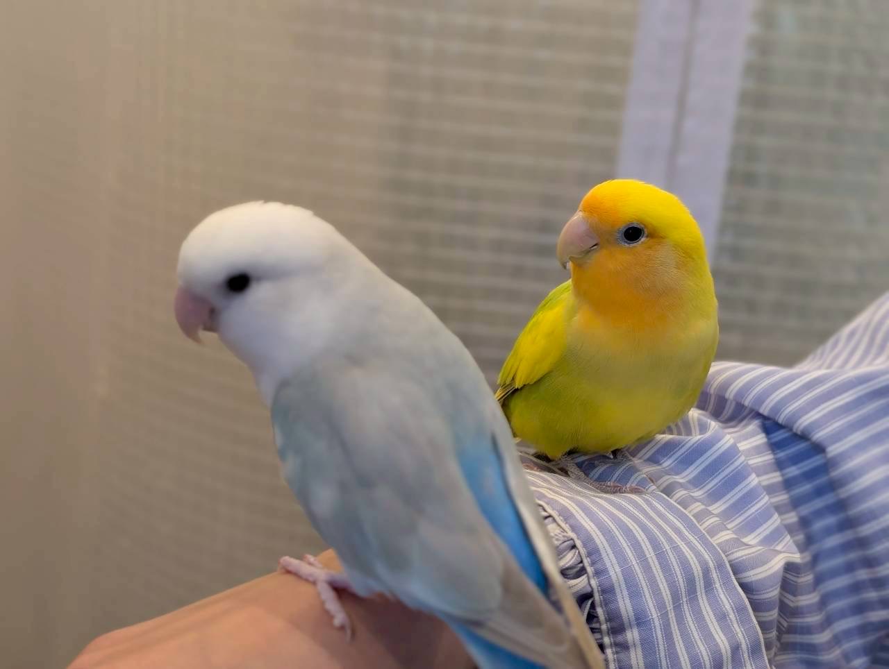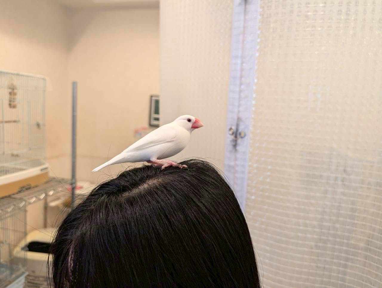 好奇心旺盛な桜文鳥が元気いっぱいに飛び回り、コザクラインコは頭を下げて「撫でて」とアピールしてくれます。