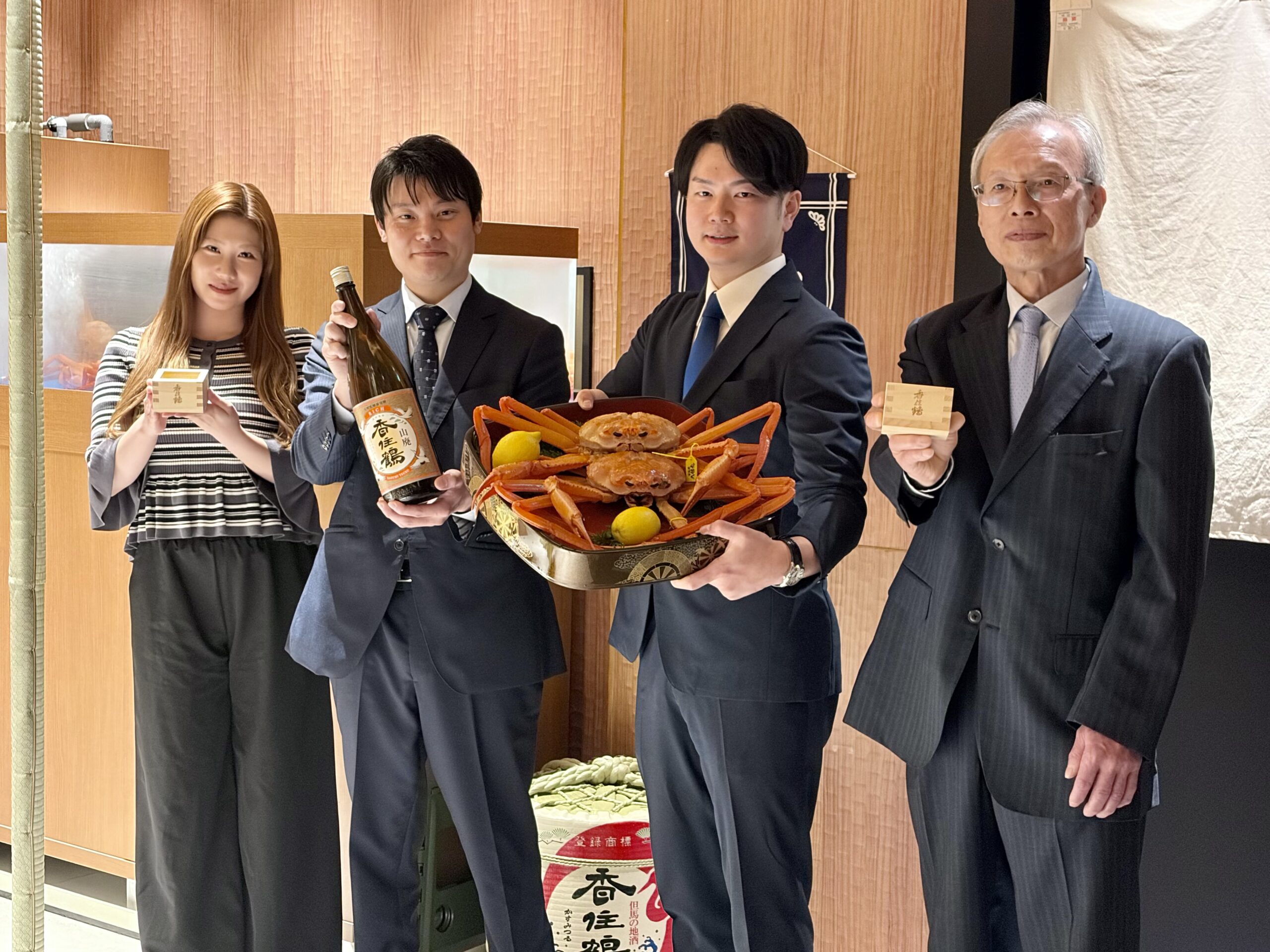 内覧会には、兵庫県香美町の香住水産加工業協同組合の田中一行組合長のほか、創業1725年の地元の酒造「香住鶴」の10代目蔵元で社長の福本和広さん、香美町観光大使を務める元NMB48の石田優美さんらも登場。